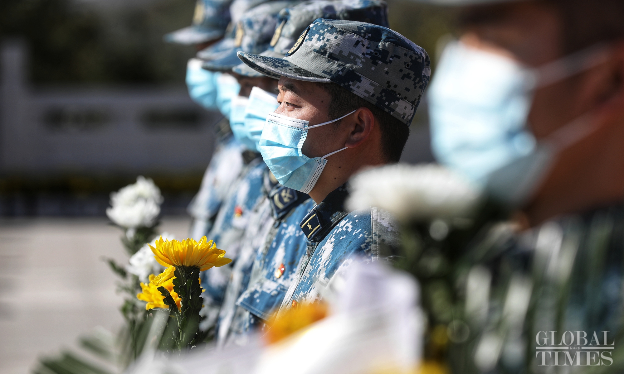 PLA Air Force soldiers stationed in Dandong, a Chinese city bordering North Korea, present flowers at a memorial hall on Fri as China commemorates the 70th anniversary of the Chinese People’s Volunteers army entering the DPRK for the War to Resist US Aggression and Aid Korea. Photo: Cui Meng/GT