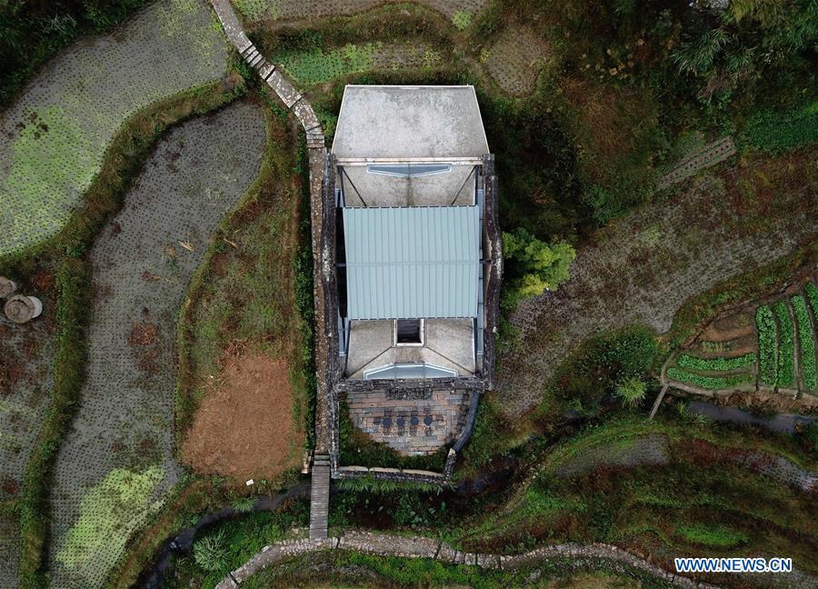 Aerial photo taken on Oct. 22, 2020 shows a view of a bookstore surrounded by paddy fields in Xiadi Village of Pingnan County, southeast China's Fujian Province. Renovated from an abandoned ancient residential house, the paddy fields-surrounded bookstore has gained attention on the web. (Xinhua/Wei Peiquan)