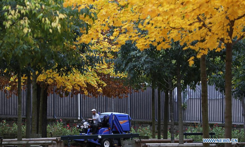 A member of staff works at the Luxembourg park in Paris, France, Oct. 23, 2020.Photo:Xinhua