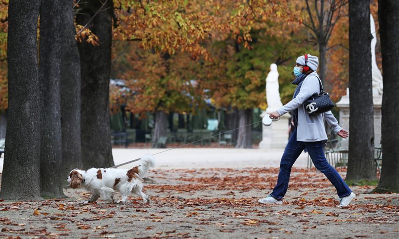 A woman walks her dog at the Luxembourg park in Paris, France, Oct. 23, 2020.Photo:Xinhua