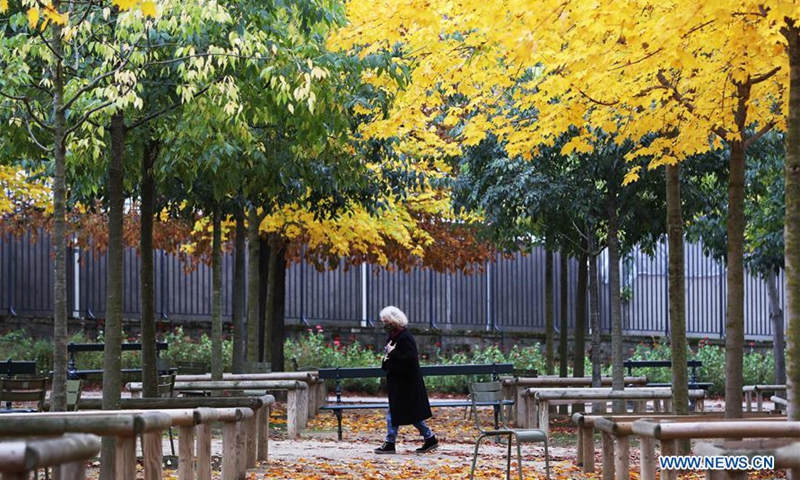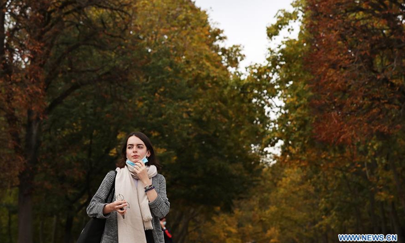 A woman takes a walk at the Luxembourg park in Paris, France, Oct. 23, 2020.Photo:Xinhua