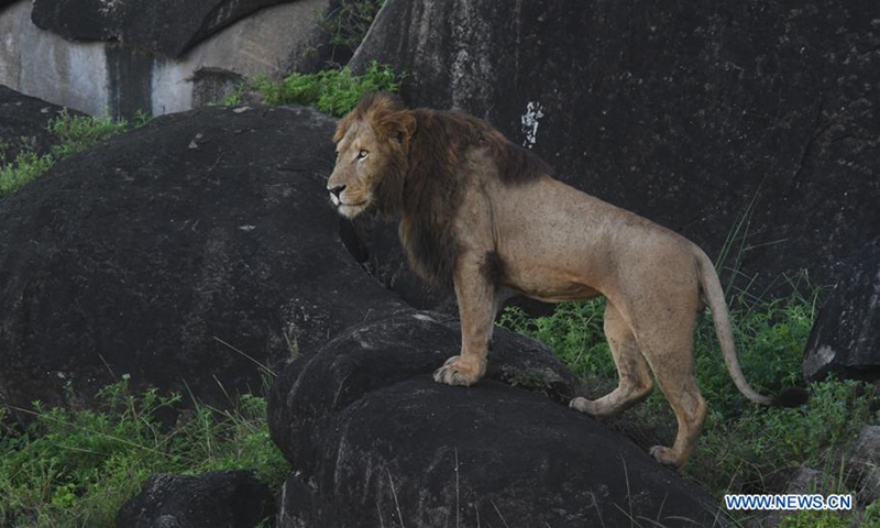 A lion stands on a rock in Kidepo Valley National Park, northeastern Uganda, Oct. 24, 2020. Uganda has reopened all its national parks in efforts to revamp the country's tourism sector which was hit by the ongoing COVID-19 pandemic. (Photo by Ronald Ssekandi/Xinhua)