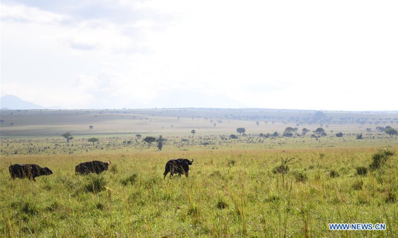 Cape buffalos graze in Kidepo Valley National Park, northeastern Uganda, Oct. 24, 2020. Uganda has reopened all its national parks in efforts to revamp the country's tourism sector which was hit by the ongoing COVID-19 pandemic. (Photo by Ronald Ssekandi/Xinhua)