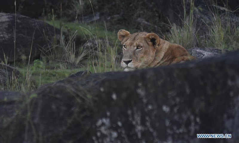 A lion rests on a rock in Kidepo Valley National Park, northeastern Uganda, Oct. 24, 2020. Uganda has reopened all its national parks in efforts to revamp the country's tourism sector which was hit by the ongoing COVID-19 pandemic. (Photo by Ronald Ssekandi/Xinhua)