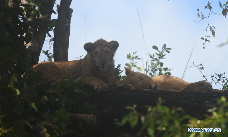 Lion cubs rest on a rock in Kidepo Valley National Park, northeastern Uganda, Oct. 24, 2020. Uganda has reopened all its national parks in efforts to revamp the country's tourism sector which was hit by the ongoing COVID-19 pandemic. (Photo by Ronald Ssekandi/Xinhua)