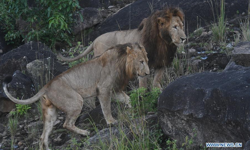 Lions walk on a rock in Kidepo Valley National Park, northeastern Uganda, Oct. 24, 2020. Uganda has reopened all its national parks in efforts to revamp the country's tourism sector which was hit by the ongoing COVID-19 pandemic. (Photo by Ronald Ssekandi/Xinhua)