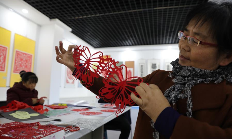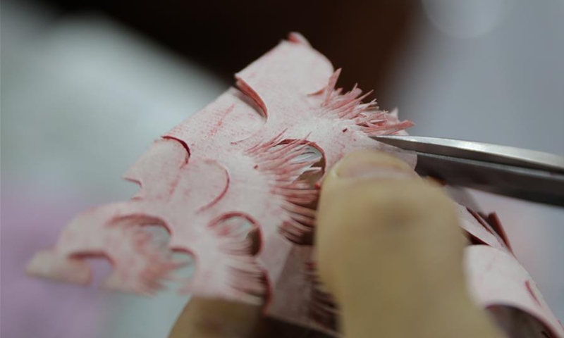 A local artist makes paper-cutting works in Huining County, northwest China's Gansu Province, Oct. 24, 2020. Local government has stepped up efforts to protect the Huining paper-cutting, an old art which was listed in the national intangible cultural heritage list of China in 2011. (Xinhua/Du Zheyu)