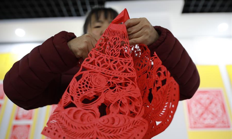 A local artist displays paper-cutting works in Huining County, northwest China's Gansu Province, Oct. 24, 2020. Local government has stepped up efforts to protect the Huining paper-cutting, an old art which was listed in the national intangible cultural heritage list of China in 2011. (Xinhua/Du Zheyu)