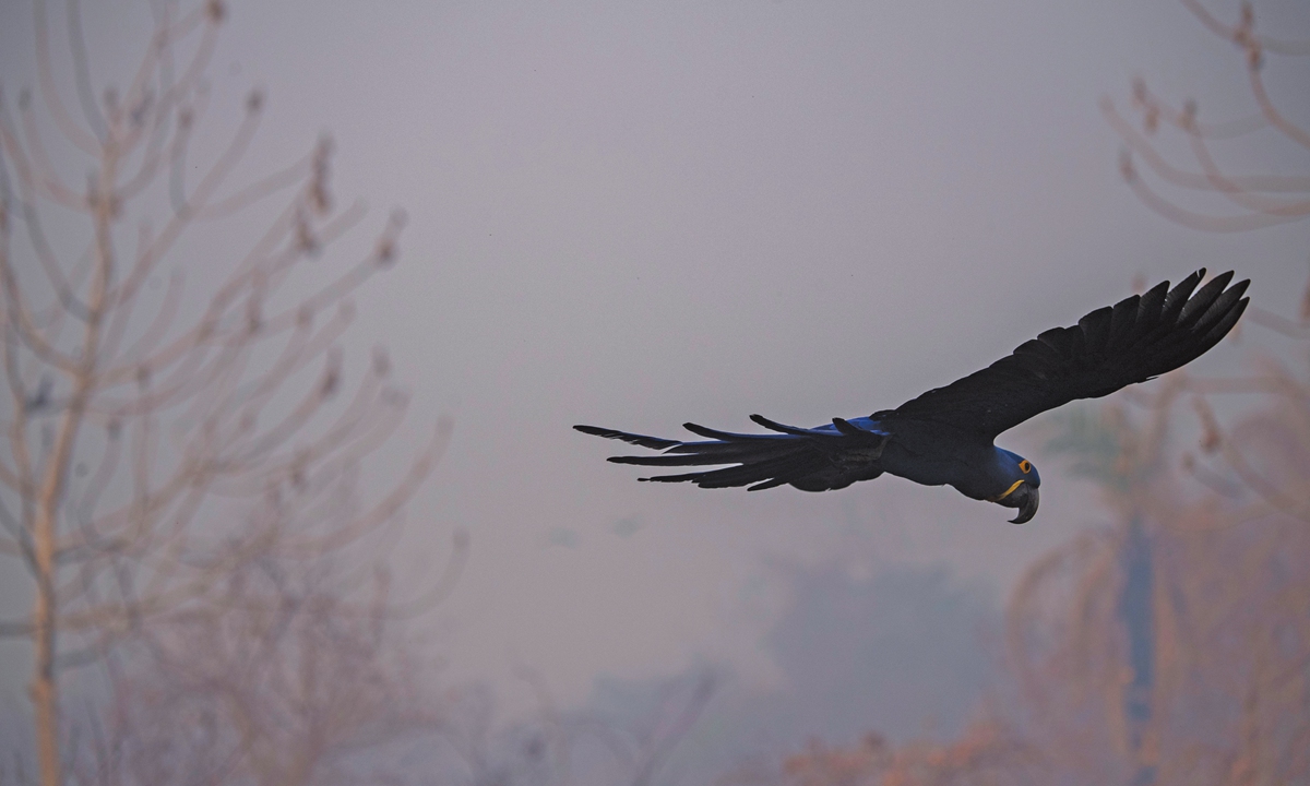 A hyacinth macaw flies over a burnt area of the wetland of Pantanal. Photos: AFP