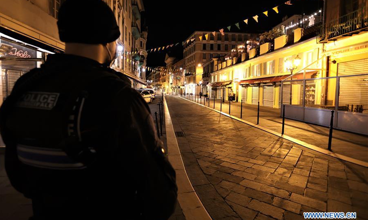 A policeman patrols during the curfew in Nice, southern France, Oct. 24, 2020. The "grave" resurgence of the epidemic has forced the French government to extend curfews, imposed since Saturday on Paris and eight other major cities, to 38 other departments. The restrictive measure now involves 46 million residents who are asked to stay home from 9 p.m. to 6 a.m. starting from Friday midnight. (Photo by Serge Haouzi/Xinhua)