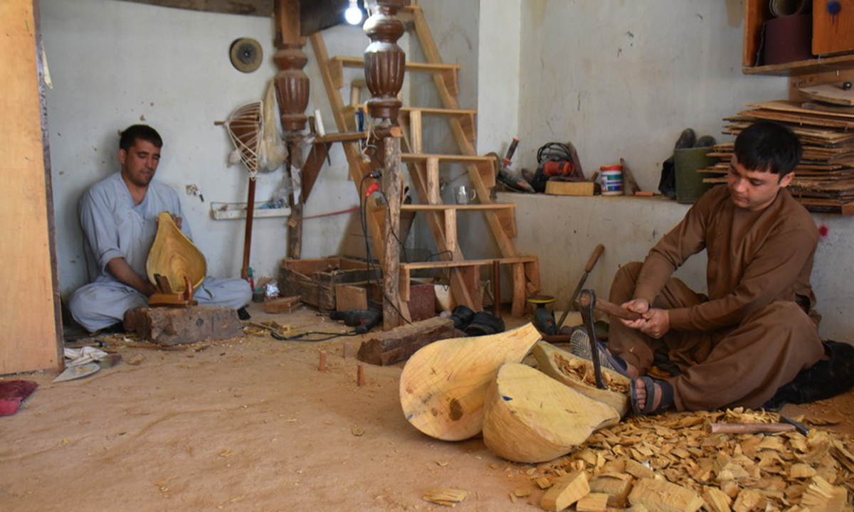 An Afghan man makes dambora, a guitar-like instrument at his shop in Aybak, capital of Samangan province, northern Afghanistan, Oct. 6, 2020. (Kawa Basharat/Xinhua)