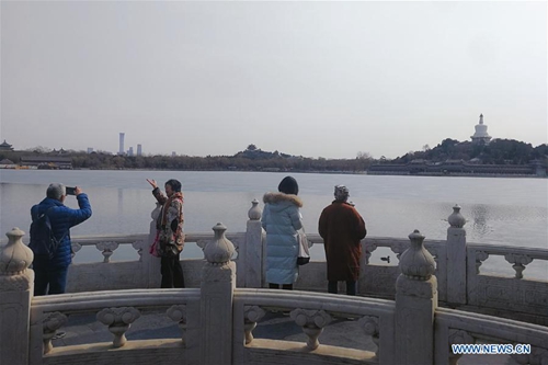 Mobile photo taken on Feb. 25, 2019 shows tourists at the Beihai Park in Beijing, capital of China. Located in downtown Beijing, Beihai Park is one of the oldest and best-preserved imperial gardens in China. (Xinhua/Zhang Chuanqi)