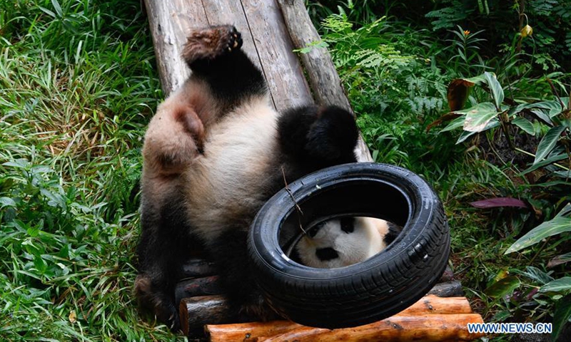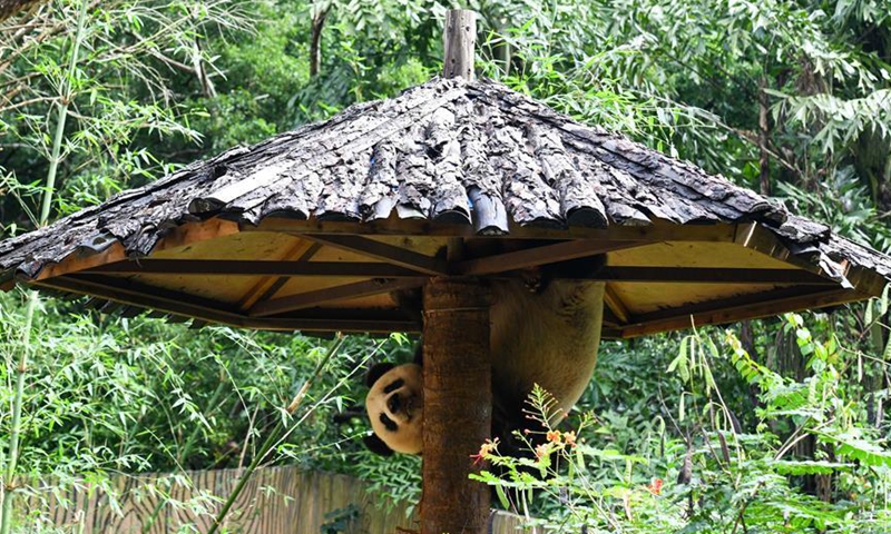 Giant panda Gonggong plays outside at Hainan Tropical Wildlife Park and Botanical Garden in Haikou, capital city of south China's Hainan Province, Oct. 26, 2020. (Xinhua/Yang Guanyu)