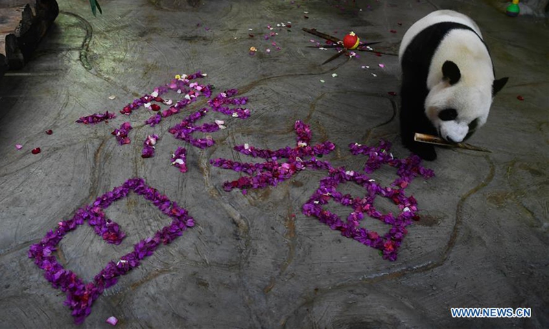 Giant panda Shunshun enjoys its food at Hainan Tropical Wildlife Park and Botanical Garden in Haikou, capital city of south China's Hainan Province, Oct. 26, 2020. (Xinhua/Yang Guanyu)