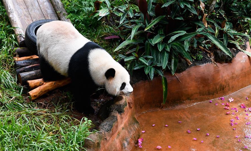 Giant panda Gonggong enjoys a bath at Hainan Tropical Wildlife Park and Botanical Garden in Haikou, capital city of south China's Hainan Province, Oct. 26, 2020. (Xinhua/Yang Guanyu)