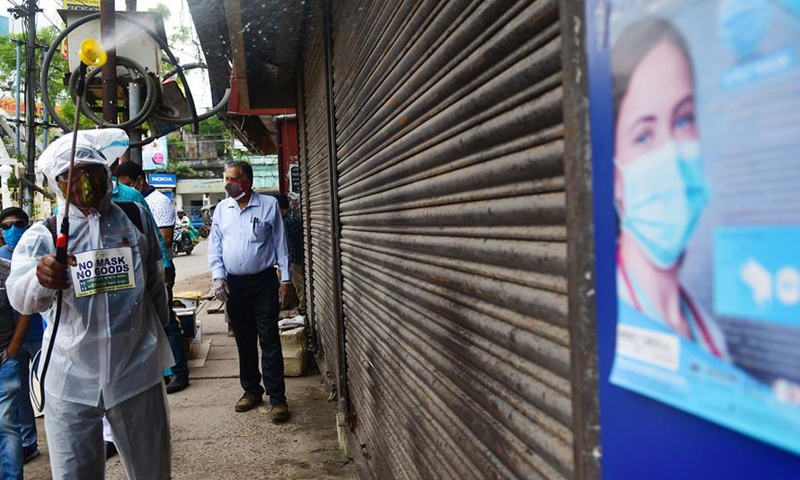 A worker sanitizes the door of a shop at a market in Agartala, the capital city of India's northeastern state of Tripura, Oct. 18, 2020. (Str/Xinhua)