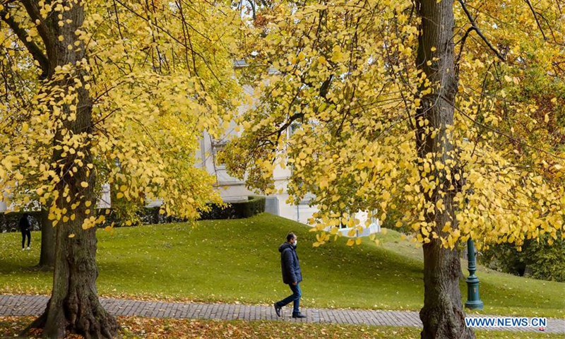 A tourist walks at the Leopold Park in Brussels, Belgium, Oct. 26, 2020. (Xinhua/Zhang Cheng)