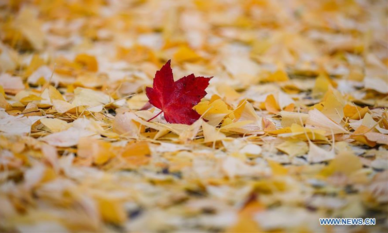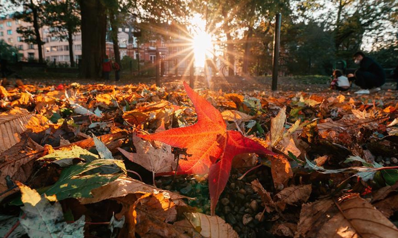 Photo taken on Oct. 23, 2020 shows fallen leaves at a park in Brussels, Belgium. (Xinhua/Zhang Cheng)