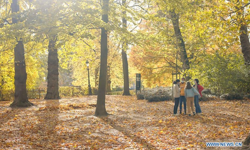 People walk at the Leopold Park in Brussels, Belgium, Oct. 26, 2020. (Xinhua/Zhang Cheng)