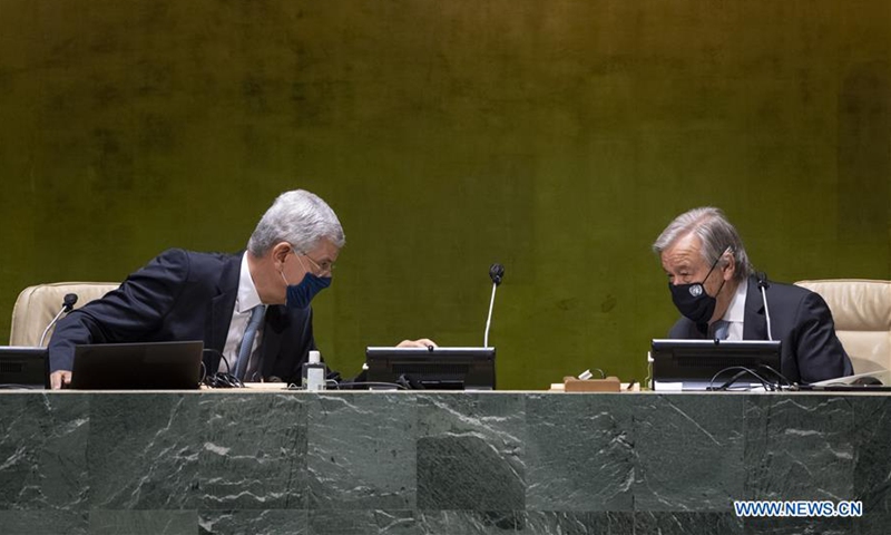 President of the United Nations General Assembly Volkan Bozkir (L) speaks with UN Secretary-General Antonio Guterres ahead of an informal plenary meeting of the UN General Assembly to commemorate United Nations Day at the UN headquarters in New York, on Oct. 26, 2020. UN Secretary-General Antonio Guterres said on Monday that international cooperation is the only way to defeat the COVID-19 pandemic and the climate emergency. (Eskinder Debebe/UN Photo/Handout via Xinhua)