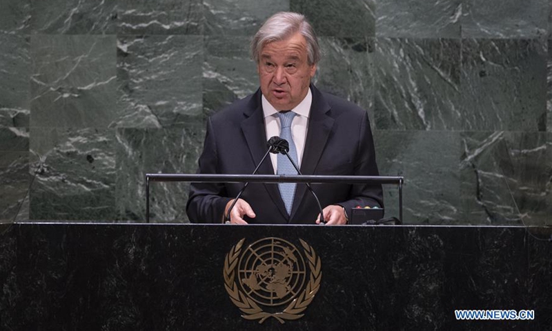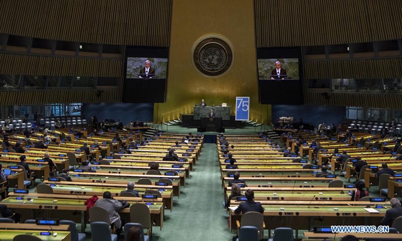 United Nations Secretary-General Antonio Guterres addresses an informal plenary meeting of the UN General Assembly to commemorate United Nations Day at the UN headquarters in New York, on Oct. 26, 2020. UN Secretary-General Antonio Guterres said on Monday that international cooperation is the only way to defeat the COVID-19 pandemic and the climate emergency. (Eskinder Debebe/UN Photo/Handout via Xinhua)