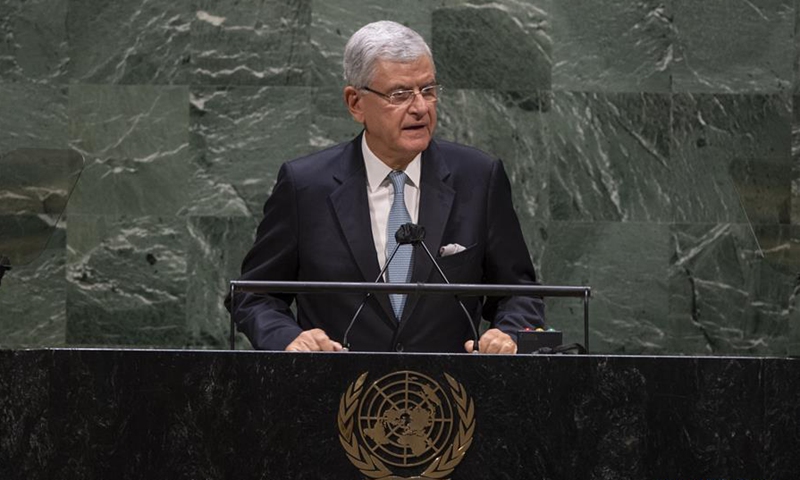 President of the United Nations General Assembly Volkan Bozkir addresses an informal plenary meeting of the UN General Assembly to commemorate United Nations Day at the UN headquarters in New York, on Oct. 26, 2020. UN Secretary-General Antonio Guterres said on Monday that international cooperation is the only way to defeat the COVID-19 pandemic and the climate emergency. (Eskinder Debebe/UN Photo/Handout via Xinhua)