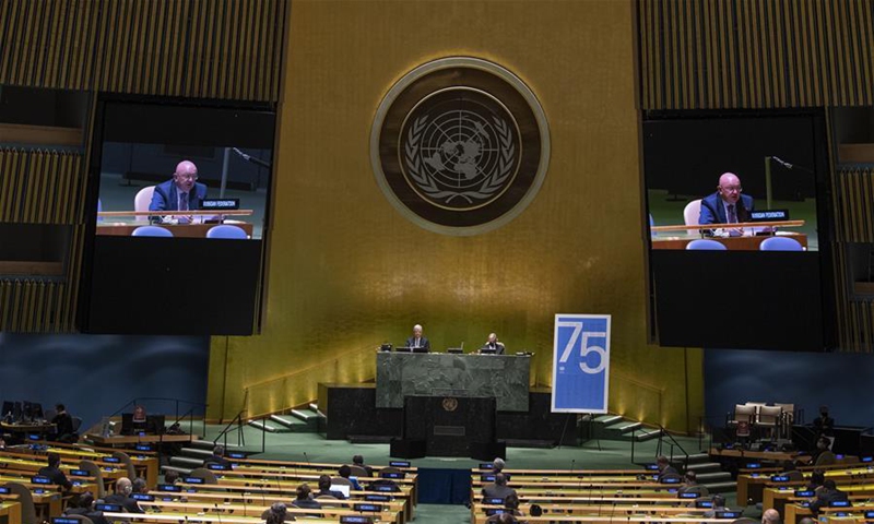Vassily Nebenzia (on the screens), Russian permanent representative to the United Nations and president of the Security Council for the month of October, addresses an informal plenary meeting of the UN General Assembly to commemorate United Nations Day at the UN headquarters in New York, on Oct. 26, 2020. UN Secretary-General Antonio Guterres said on Monday that international cooperation is the only way to defeat the COVID-19 pandemic and the climate emergency. (Eskinder Debebe/UN Photo/Handout via Xinhua)