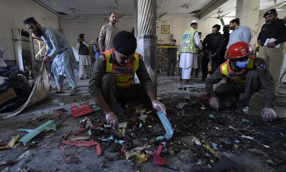 Security officials examine the site of a blast at a religious school in Peshawar on Tuesday. At least seven students were killed and dozens more wounded when a bomb exploded during a class at their religious school in Pakistan, officials said. Photo: AFP