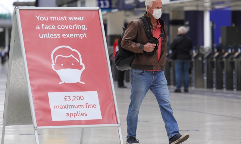 A man walks past a sign warning of fines for not wearing a face covering at Waterloo Station in London, Britain, on September 23. Photo: Xinhua
