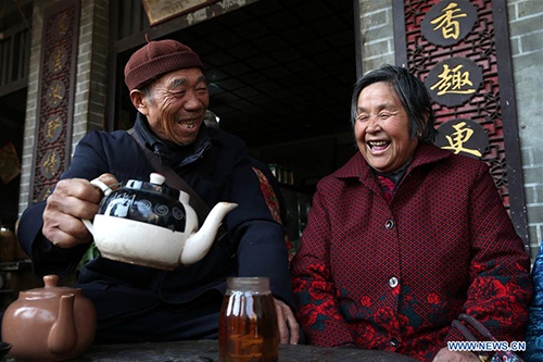 An old couple enjoy their tea time at an old teahouse in the ancient town of Linhuan, east China's Anhui Province, Nov. 26, 2017. Spending leisure time at teahouse is a popular way for people living or staying in Linhuan Town. (Xinhua/Wan Shanchao)