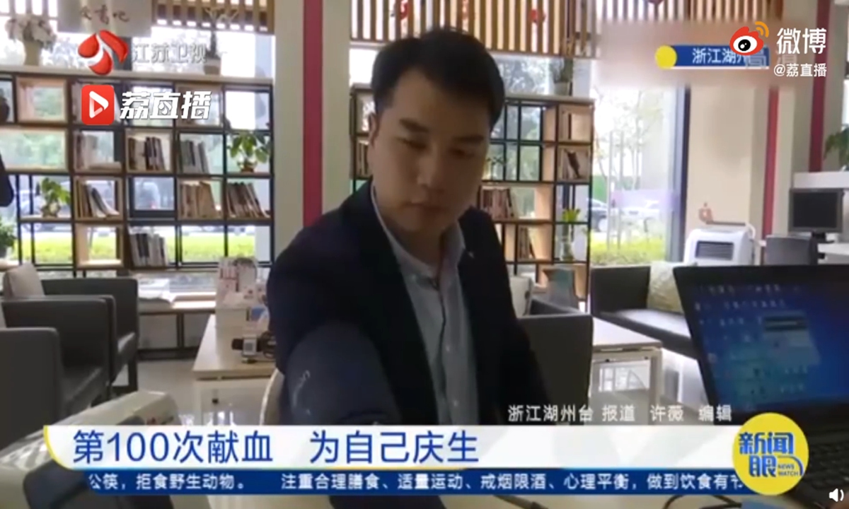 A man in Huzhou, East China's Zhejiang Province, has donated blood for the 100th time as a special birthday gift for himself as he turned 37, People's Daily reported on Monday. Screenshot of video by Li Video on Sina Weibo.