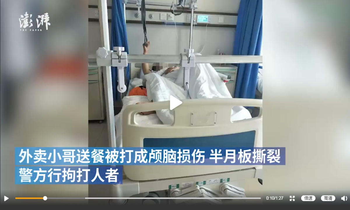 A deliveryman from Chengdu, Southwest China's Sichuan Province, was struck on the head by a customer he was delivering food to, because "he called me on the phone when I clearly asked him not to," according to the customer. Screenshot of video by The Paper on Sina Weibo.