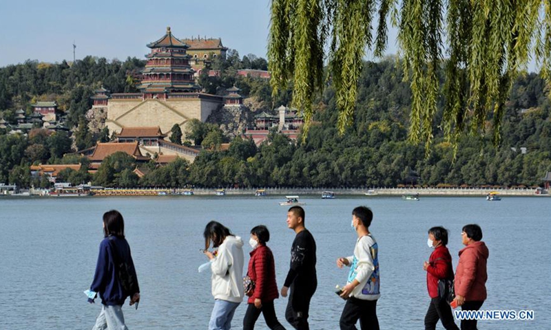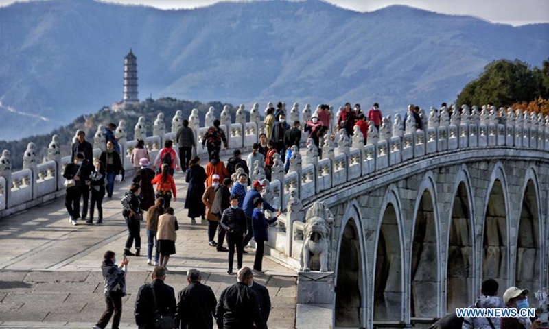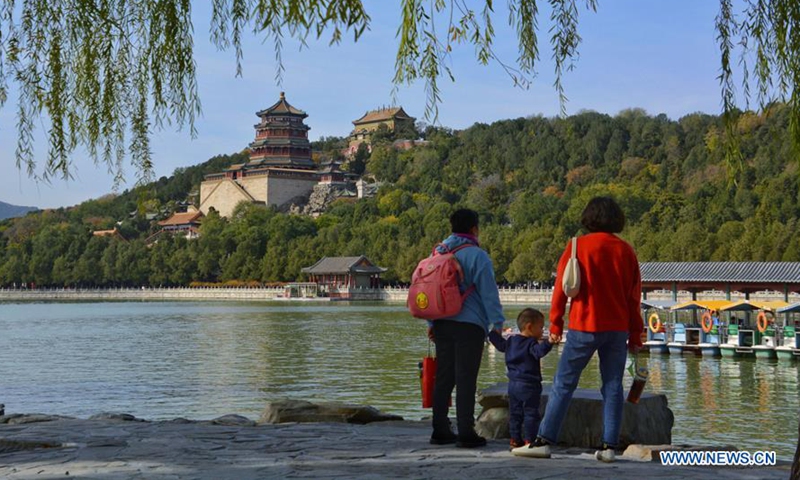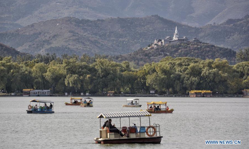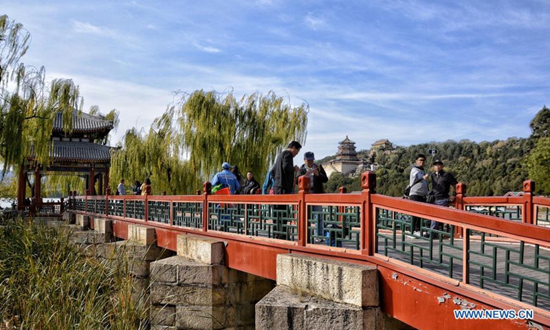 Tourists enjoy the autumn scenery at the Summer Palace in Beijing, capital of China, Oct. 27, 2020. (Xinhua/Li Xin)