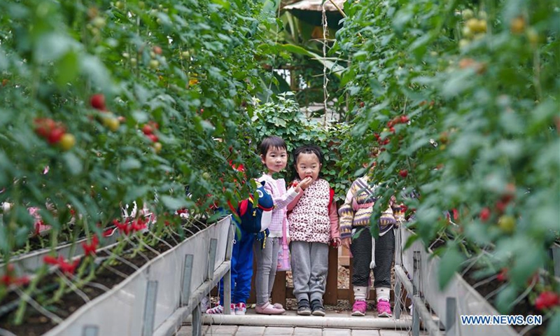 A group of children visit a modern agricultural industry park in Tongshan District, Xuzhou, east China's Jiangsu Province, Oct. 27, 2020. Authorities in Tongshan District have taken steps to optimize the local agricultural sector by combining modern agriculture with urban tourism. Altogether, the district's 300-plus agritourism parks have received some four million visitors in 2019. (Xinhua/Li Bo)
