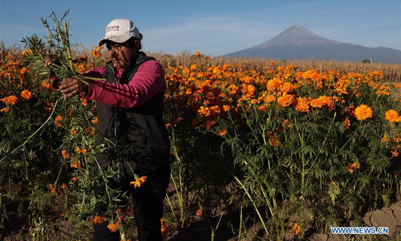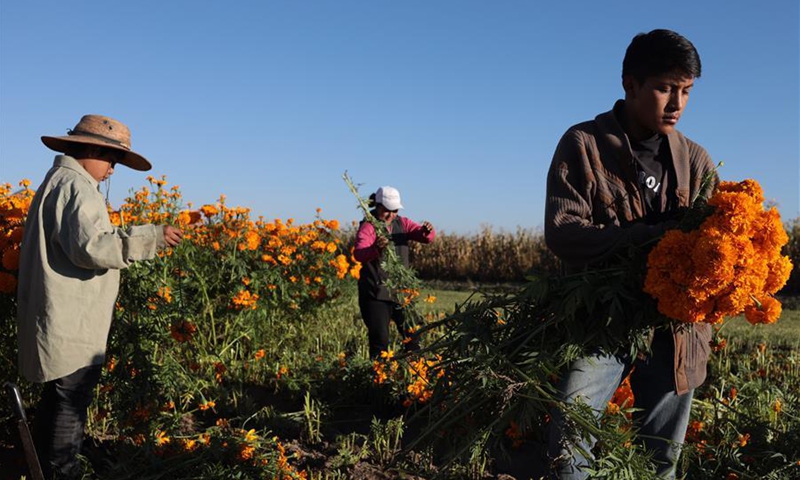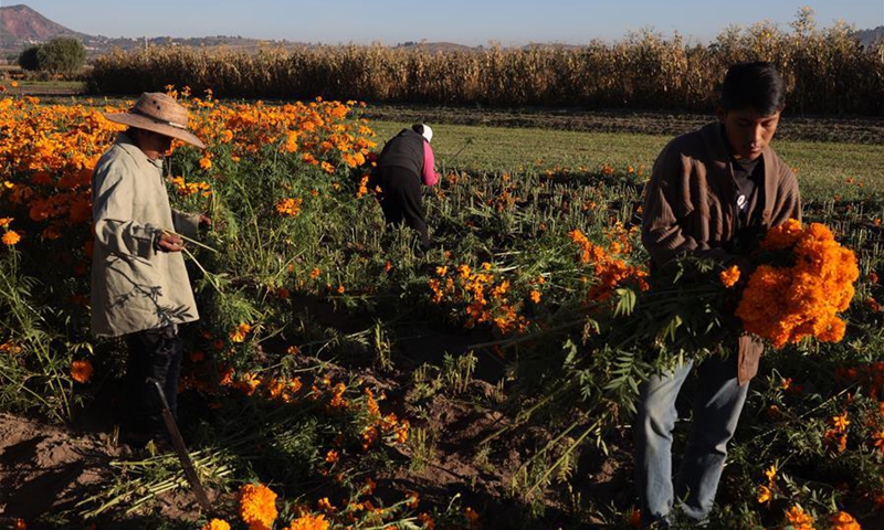 Peasants harvest cempasuchil (Mexican marigold) flowers in Puebla state, Mexico, on Oct. 26, 2020. The Cempasuchil flower is used in Mexico to celebrate the Day of the Dead. (Photo by David Peinado/Xinhua)