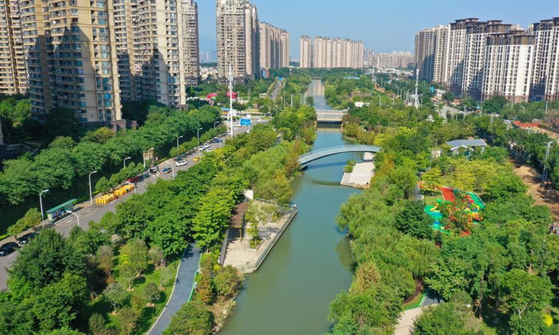 Aerial photo taken on Oct. 23, 2020 shows scenery along the Liuhua River in Cangshan District of Fuzhou, southeast China's Fujian Province. (Xinhua/Lin Shanchuan)