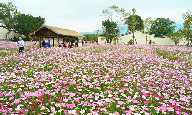 People visit a flower field at the Liangcuo historical community in Cangshan District of Fuzhou, southeast China's Fujian Province, Oct. 21, 2020. (Xinhua/Lin Shanchuan)