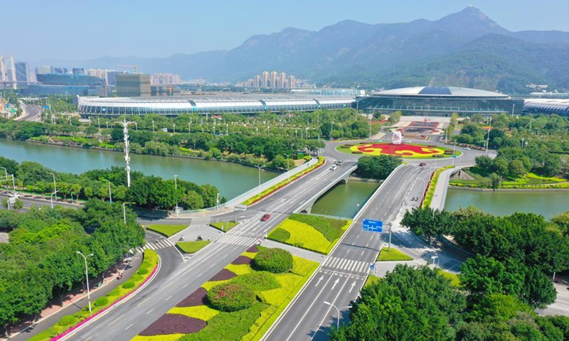 Aerial photo taken on Oct. 26, 2020 shows the Fuzhou Strait International Conference and Exhibition Center and its surroundings in Fuzhou, southeast China's Fujian Province. (Xinhua/Lin Shanchuan)