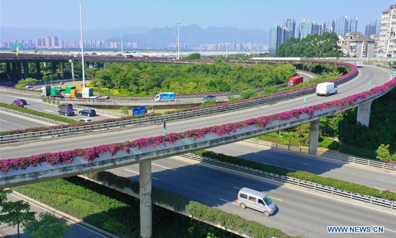 Aerial photo taken on Oct. 23, 2020 shows an elevated road decorated with bougainvillea flowers in Fuzhou, southeast China's Fujian Province. (Xinhua/Lin Shanchuan)