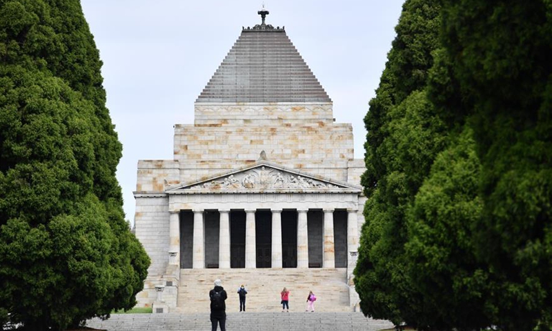 People wearing masks visit Shrine of Remembrance in Melbourne, Victoria, Australia, on Oct. 19, 2020. After more than three months of lockdown, metropolitan Melbourne moved from second step to third step of restrictions, and regional Victoria continues in third step with further easing of restrictions from midnight of Oct. 27. The whole state recorded zero new COVID-19 infection and virus-related death for a second day in a row on Oct. 27. (Photo by Bai Xue/Xinhua)