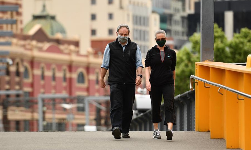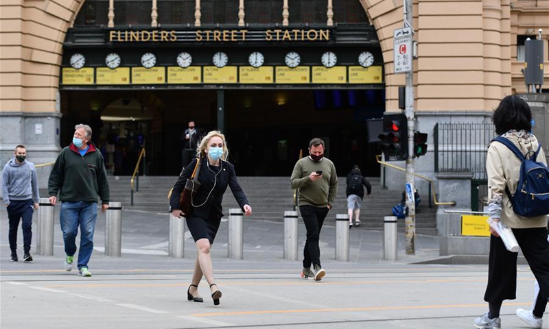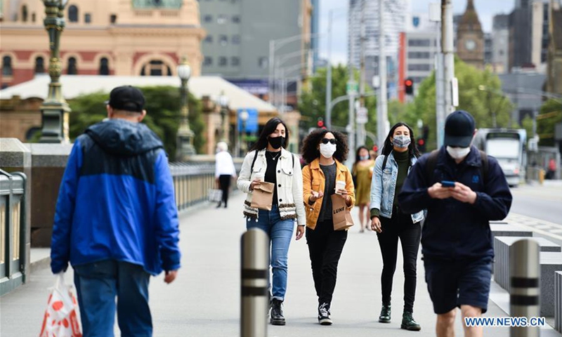 People wearing masks walk in CBD of Melbourne, Victoria, Australia, on Oct. 19, 2020. After more than three months of lockdown, metropolitan Melbourne moved from second step to third step of restrictions, and regional Victoria continues in third step with further easing of restrictions from midnight of Oct. 27. The whole state recorded zero new COVID-19 infection and virus-related death for a second day in a row on Oct. 27. (Photo by Bai Xue/Xinhua)