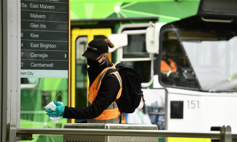 A worker wearing mask cleans the tram station in CBD of Melbourne, Victoria, Australia, on Oct. 19, 2020. After more than three months of lockdown, metropolitan Melbourne moved from second step to third step of restrictions, and regional Victoria continues in third step with further easing of restrictions from midnight of Oct. 27. The whole state recorded zero new COVID-19 infection and virus-related death for a second day in a row on Oct. 27. (Photo by Bai Xue/Xinhua)