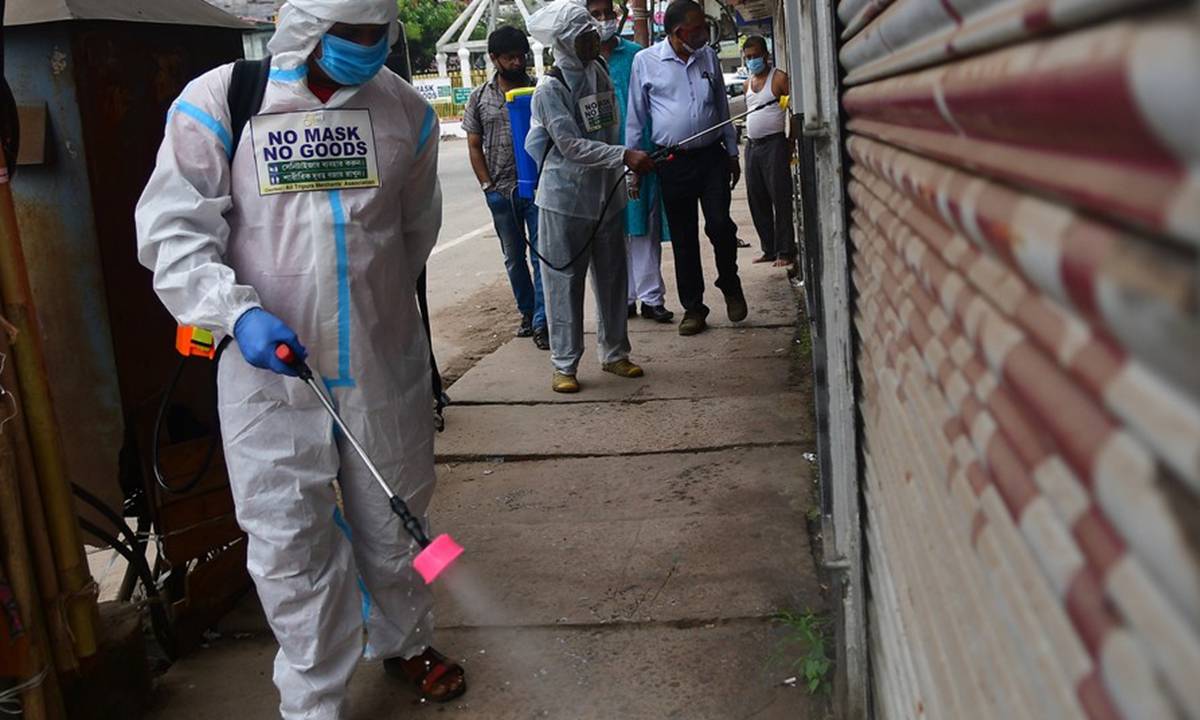 Workers sanitize the doors of shops at a market in Agartala, the capital city of India's northeastern state of Tripura, Oct. 18, 2020. (Str/Xinhua)