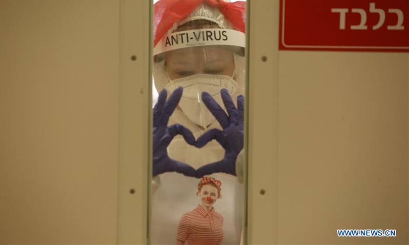 An Israeli medical clown wearing protective gear makes a finger heart before she visits young patients at the COVID-19 department of Sheba Medical Center in the central Israeli city of Ramat Gan on Oct. 20, 2020. About 100 medical clowns of the Dream Doctors Project (DDP) are acting under stringent health precautions at around 30 Israeli hospitals to bring happiness to patients amid the coronavirus pandemic. (Photo by Gil Cohen Magen/Xinhua)