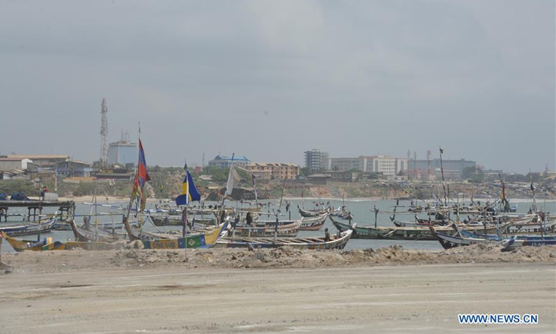 Photo taken on Oct. 27, 2020 shows the China-aided Jamestown Fishing Port Complex under construction in Accra, Ghana. The China-aided Jamestown Fishing Port Complex in Ghana is expected to boost the country's fishing industry, said the Chinese constructor in an interview with Xinhua. (Photo by Seth/Xinhua)