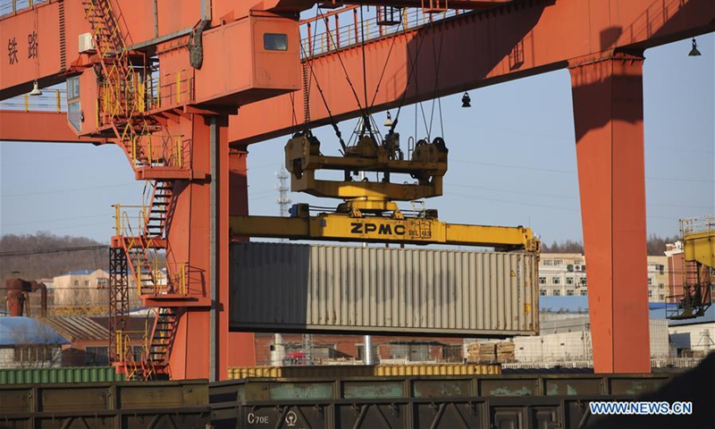 A container is lifted by a gantry crane at Suifenhe Railway Port in Suifenhe, northeast China's Heilongjiang Province, Oct. 28, 2020. As of Tuesday, the 2020 import and export volume of the Suifenhe Railway Port, an important Chinese port for trade with Russia, hit 8.009 million tons, of which mineral powder imports increased by 64 percent year on year. (Photo by Zhang Tao/Xinhua)