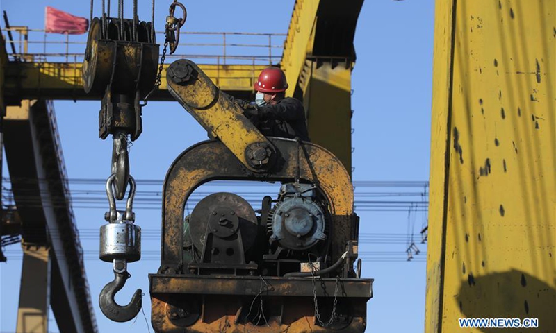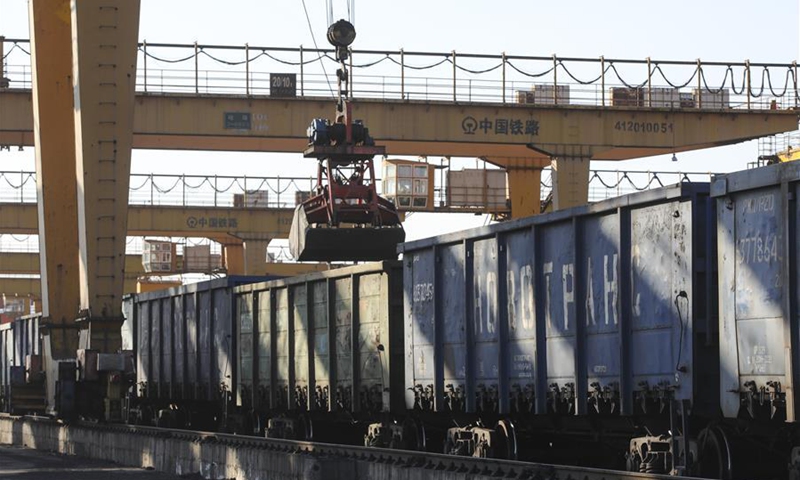 A gantry crane is operated at Suifenhe Railway Port in Suifenhe, northeast China's Heilongjiang Province, Oct. 28, 2020. As of Tuesday, the 2020 import and export volume of the Suifenhe Railway Port, an important Chinese port for trade with Russia, hit 8.009 million tons, of which mineral powder imports increased by 64 percent year on year. (Photo by Zhang Tao/Xinhua)