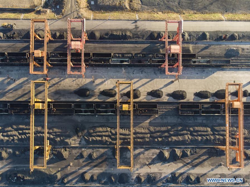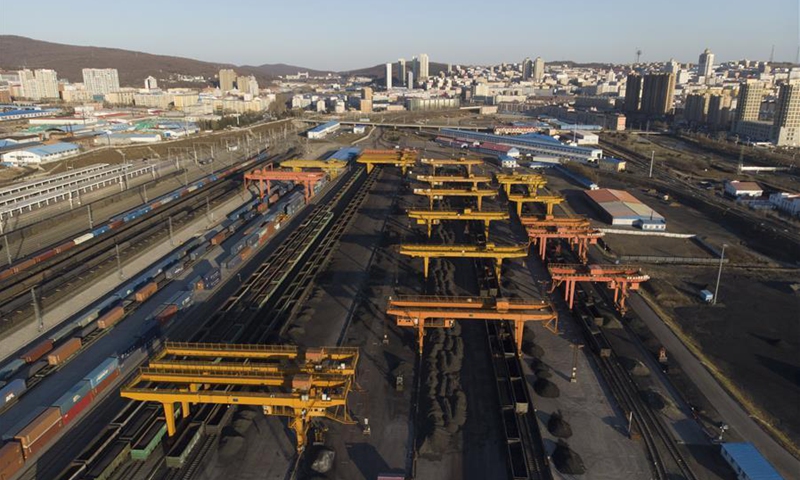 Aerial photo taken on Oct. 28, 2020 shows a view of Suifenhe Railway Port in Suifenhe, northeast China's Heilongjiang Province. As of Tuesday, the 2020 import and export volume of the Suifenhe Railway Port, an important Chinese port for trade with Russia, hit 8.009 million tons, of which mineral powder imports increased by 64 percent year on year. (Photo by Zhang Tao/Xinhua)