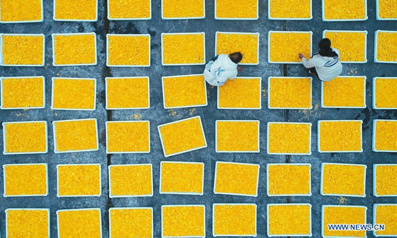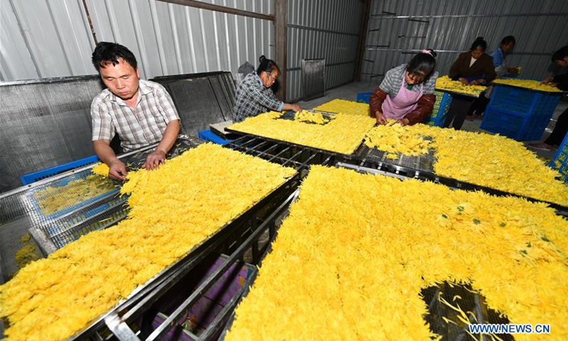Villagers arrange chrysanthemum flowers for drying in Jinxi Village of Xima Township, Longli County of southwest China's Guizhou Province, Oct. 27, 2020. Thanks to the chrysanthemum industry, 166 poverty-stricken households in Jinxi Village were lifted out of poverty in 2019. (Xinhua/Yang Wenbin)