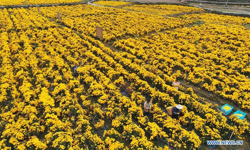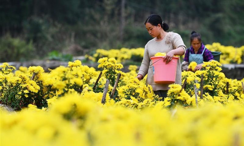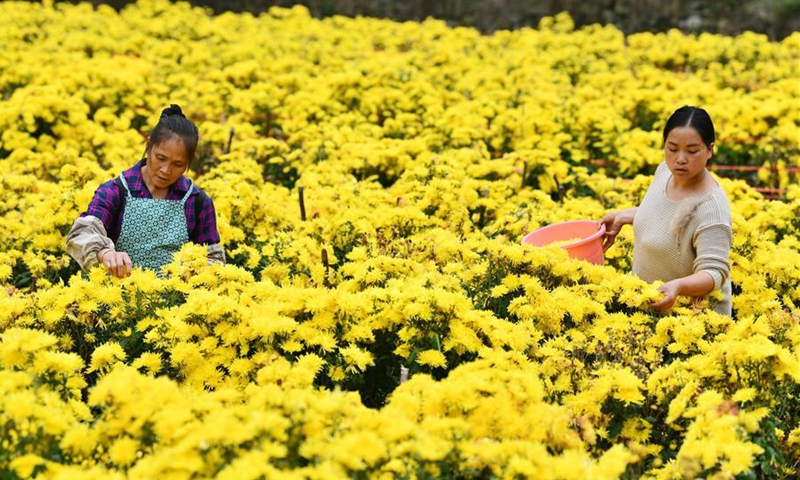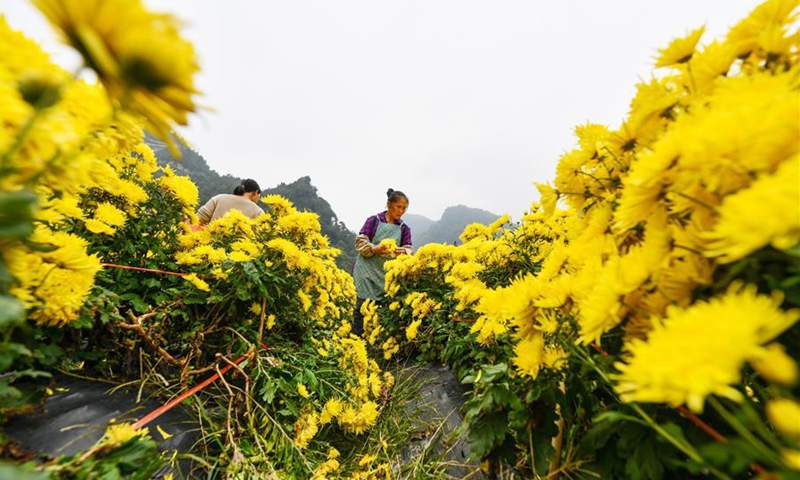 Villagers pluck chrysanthemum flowers in Jinxi Village of Xima Township, Longli County of southwest China's Guizhou Province, Oct. 27, 2020. Thanks to the chrysanthemum industry, 166 poverty-stricken households in Jinxi Village were lifted out of poverty in 2019. (Xinhua/Yang Wenbin)